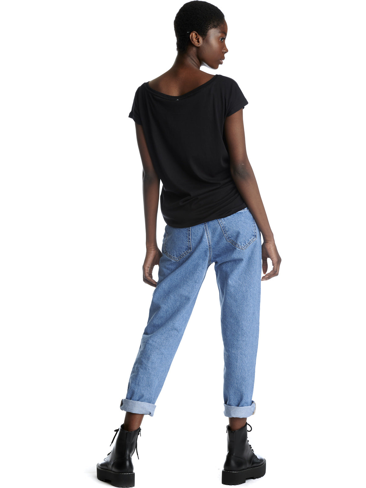 Dieses Damen T-Shirt besteht aus einem angenehmen Baumwollmaterial. Es ist locker geschnitten, hat einen weiten runden Halsausschnitt und kurze Ärmel.