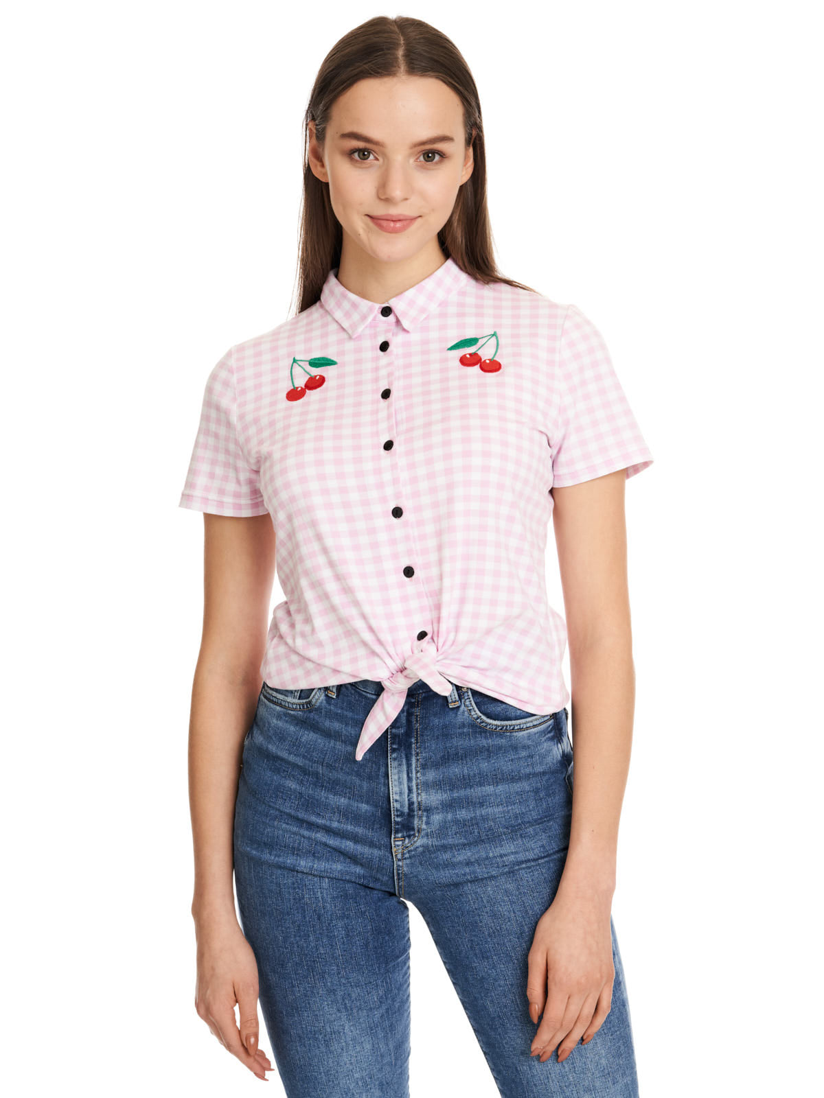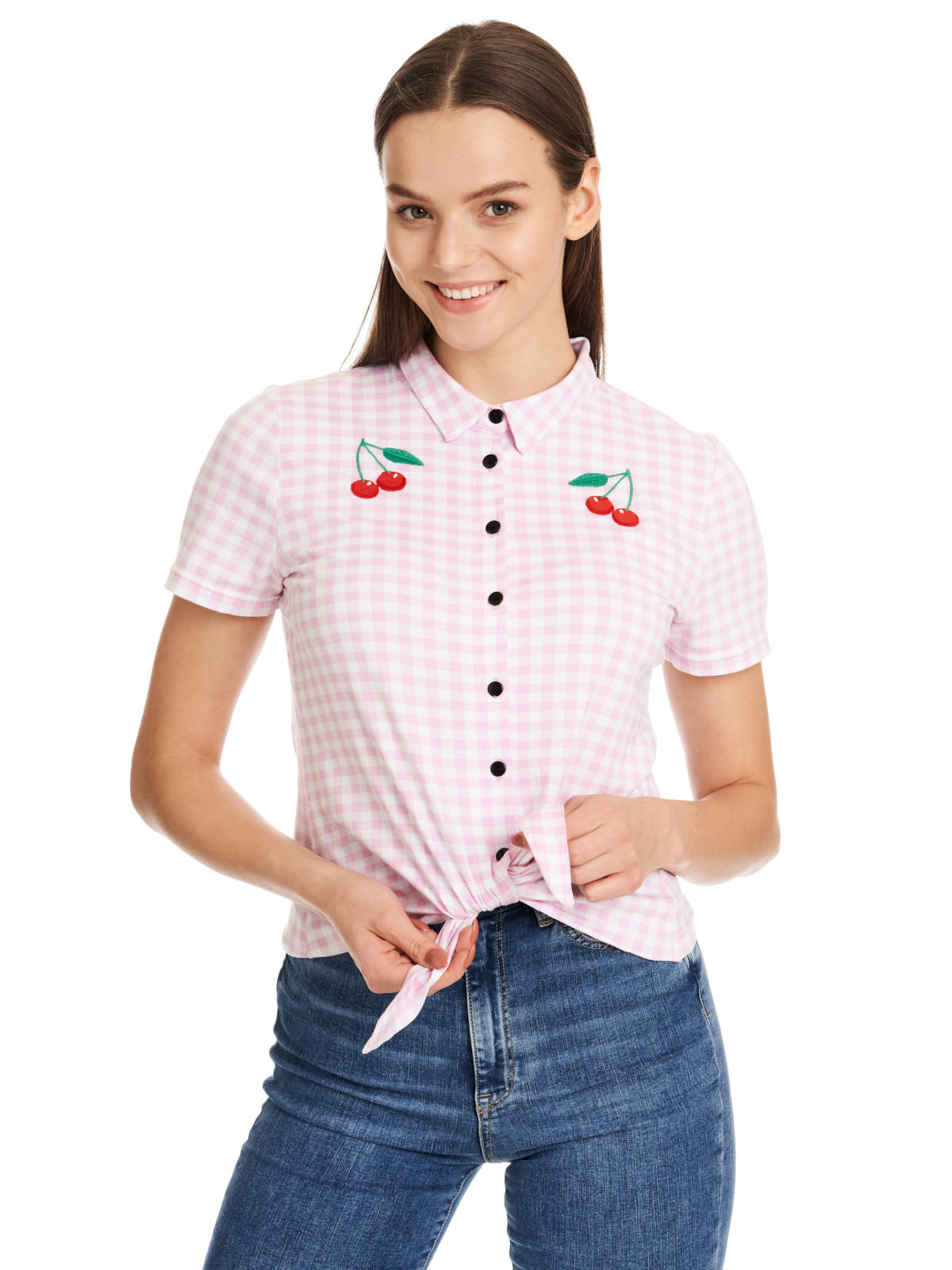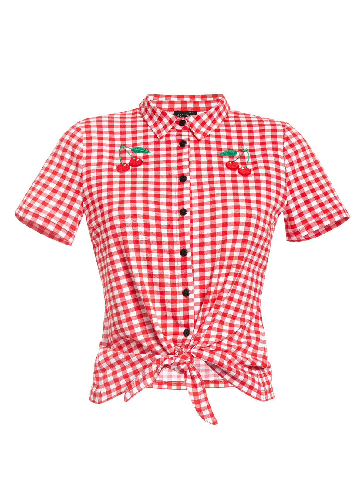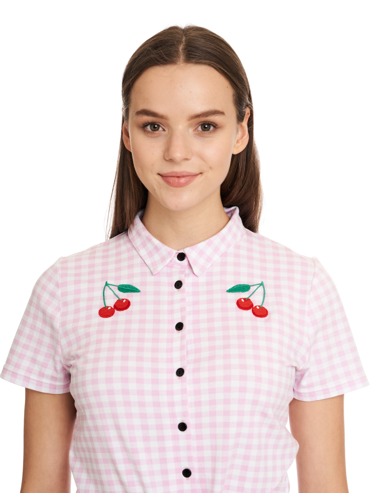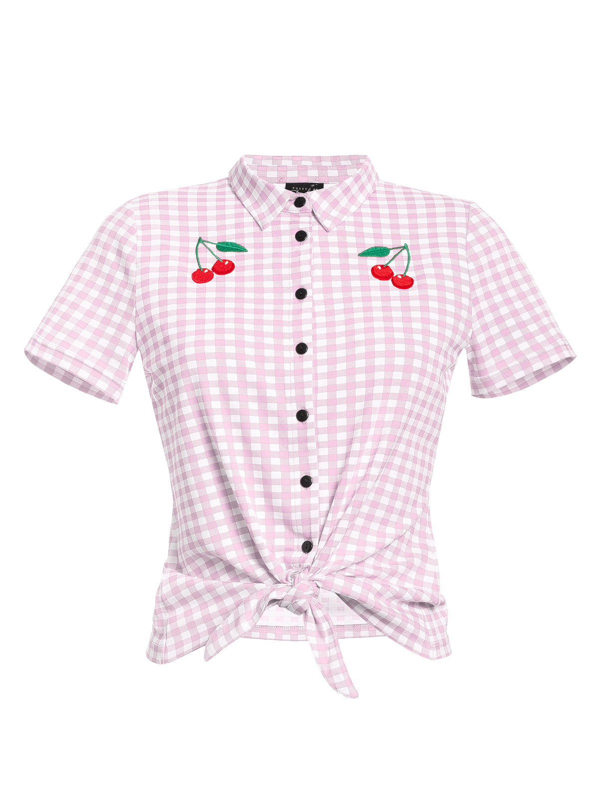 Candy-Time mit Pussy Deluxe Die süße Pussy Deluxe Kurzbluse ist aus einem angenehmen Baumwollmaterial mit Elasthananteil. Sie ist figurbetont geschnitten, hat kurze Arme, einen runden Halsausschnitt und eine durchgängige Knopfleiste, die unten mit einem Bindeband zusammengeknotet wird. Das Highlight bilden zwei gestickte Kirschen im vorderen Schulterbereich. Das Muster zeigt Karos in verschiedenen rosatönen. Die 'Lightpink Plaid Short Blouse' passt hervorragend zur Bluejeans und Wedges. Wem die Farbe etwas zu candymäßig ist, der findet gute Alternativen in der 'red' oder der 'blue' Variante.