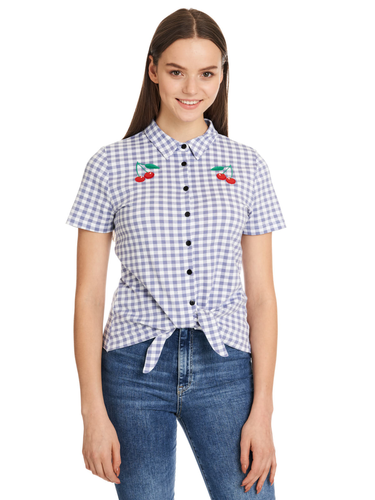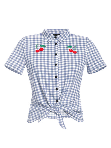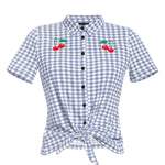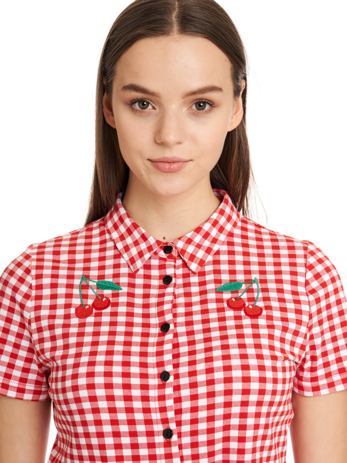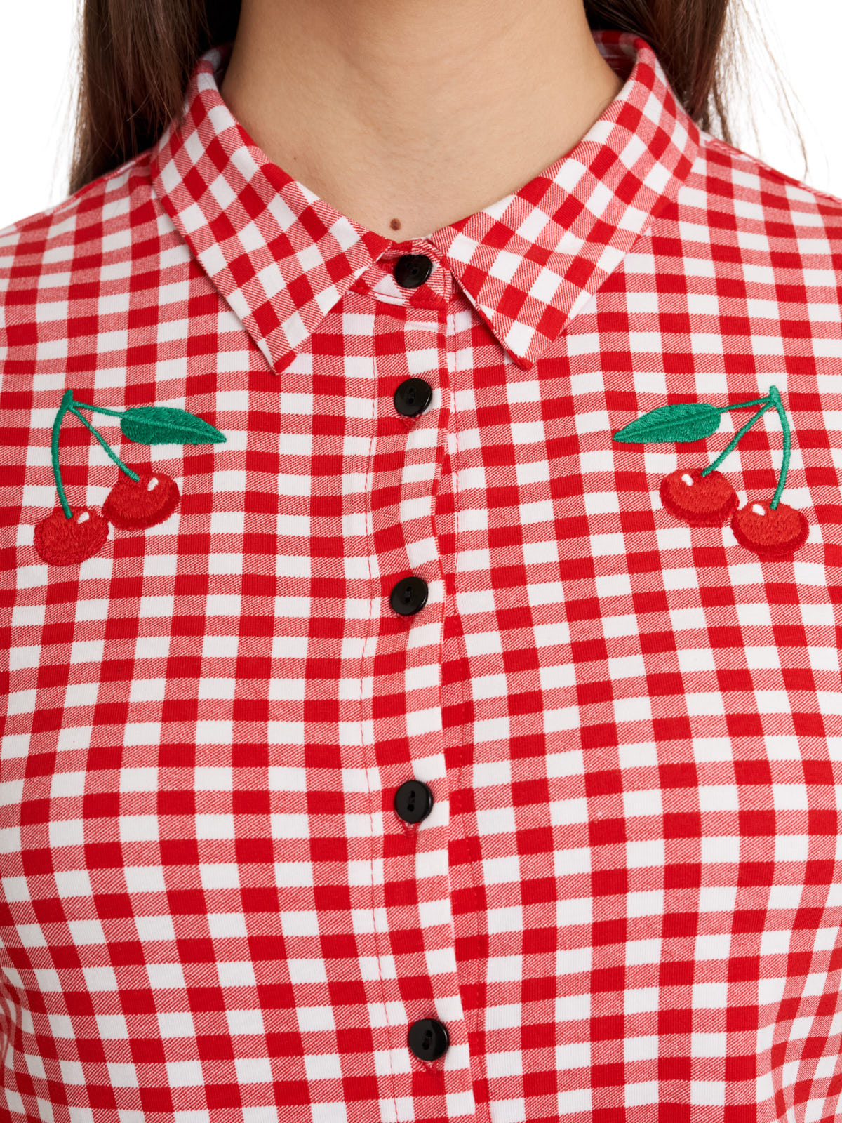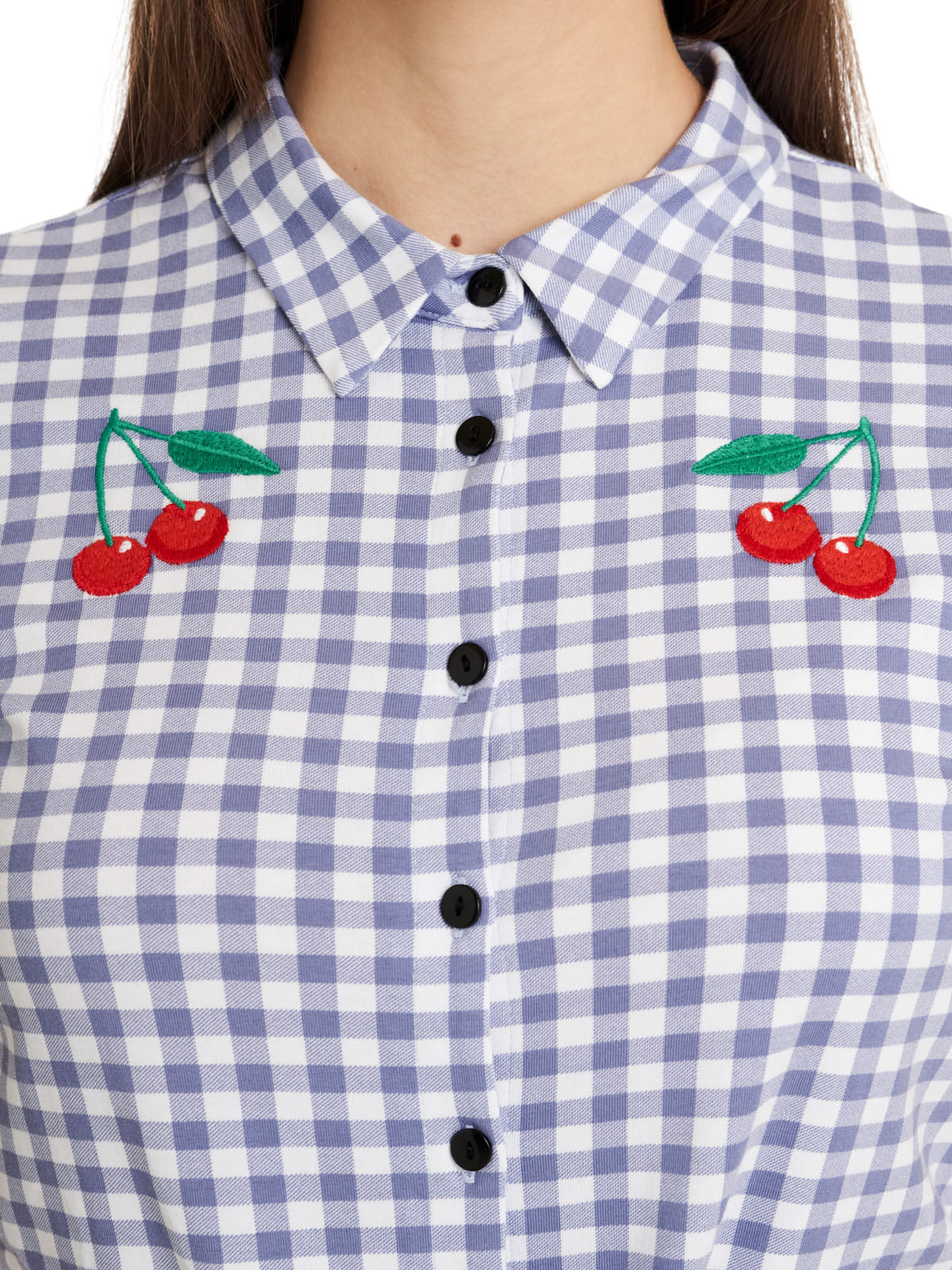 Candy-Time mit Pussy Deluxe Die süße Pussy Deluxe Kurzbluse ist aus einem angenehmen Baumwollmaterial mit Elasthananteil. Sie ist figurbetont geschnitten, hat kurze Arme, einen runden Halsausschnitt und eine durchgängige Knopfleiste, die unten mit einem Bindeband zusammengeknotet wird. Das Highlight bilden zwei gestickte Kirschen im vorderen Schulterbereich. Das Muster zeigt Karos in verschiedenen rosatönen. Die 'Lightpink Plaid Short Blouse' passt hervorragend zur Bluejeans und Wedges. Wem die Farbe etwas zu candymäßig ist, der findet gute Alternativen in der 'red' oder der 'blue' Variante.