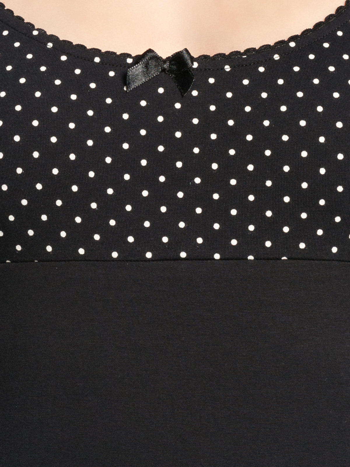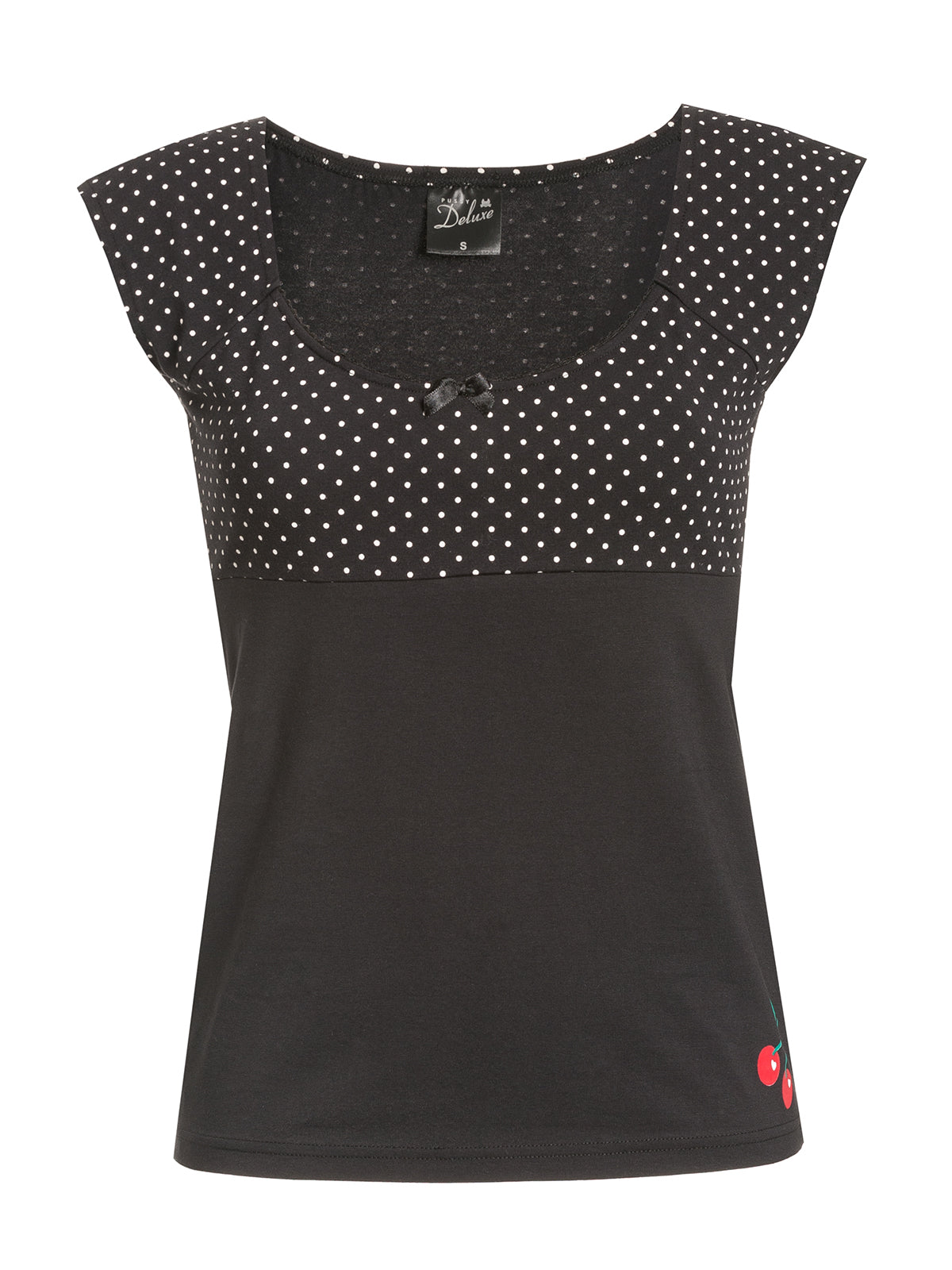 Das schicke Pussy Deluxe Shirt überzeugt mit schlichter Eleganz, süßen Details und einem tollen Materialgemisch aus Baumwolle und Elasthan. Es ist figurbetont geschnitten, hat kurze Arme und einen großen runden Halsausschnitt, der mit einer schwarzen Litze und einer kleinen Satinschleife verziert ist. Der komplette obere Bereich bis zu Unterbrustnaht ist mit kleine weißen Punkten, also Polka-Dots bedruckt, das restliche Shirt ist schwarz. Auf der linken unteren Seite sind zwei aufgedruckte Kirschen. Die Spiegelung wird jeweils als Herz dargestellt. Ein grünes Blatt in Form eines Katzenkopfes erinnert an die früheren Pussy Deluxe Modelle. Eine tolle Mischung, die Alt und Neu miteinander vereint. Das coole Shirt ist vielfältig kombinierbar. Es passt super gut zur angesagten Marlene Hose, aber auch zu Skinny Jeans und Longcardigan. Für welchen Style entscheidest du dich?