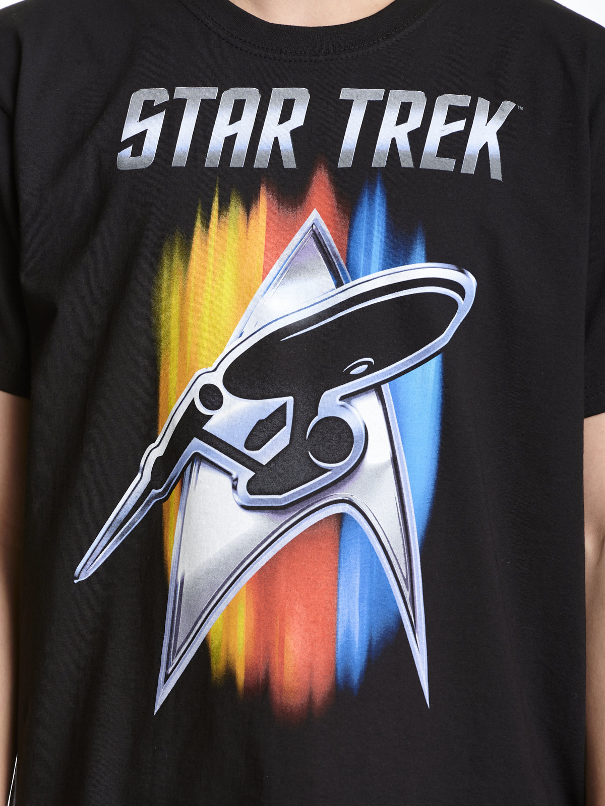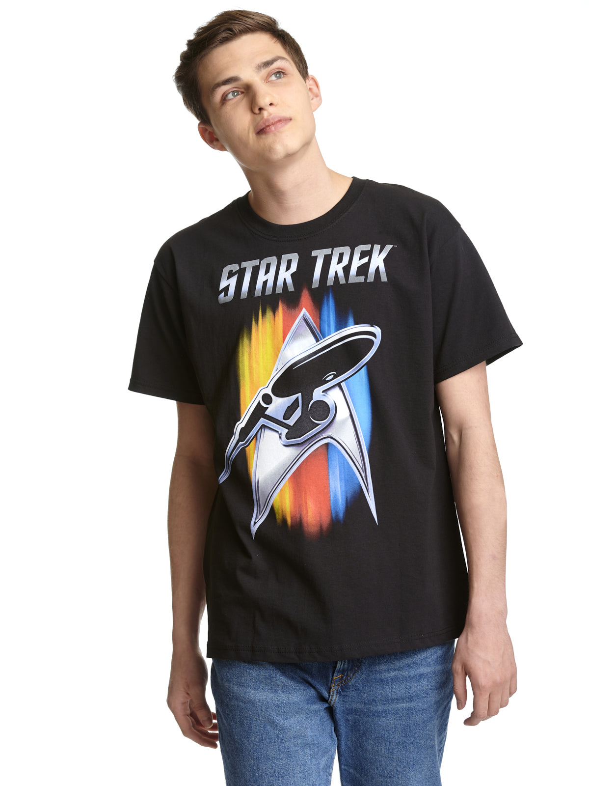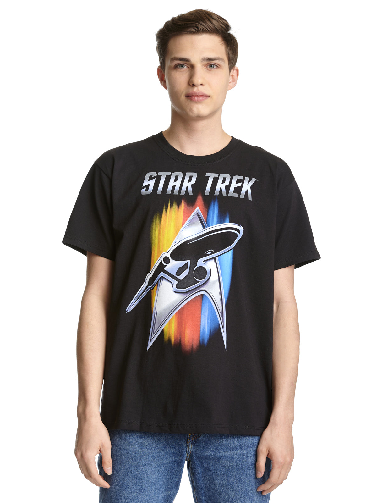 Der mega coole Druck zeigt das Sternflottenabzeichen sowie das Raumschiff Enterprise. Im Hintergrund sieht man drei Farbstreifen, die das Logo förmlich zum leuchten bringen. Der Schriftzug 'Star Trek' komplettiert das Gesamtbild. Dieses Shirt ist ein Must-have für alle Fans, egal welche Star Trek Serie ihr favorisiert, mit diesem Shirt liegt ihr garantiert richtig.