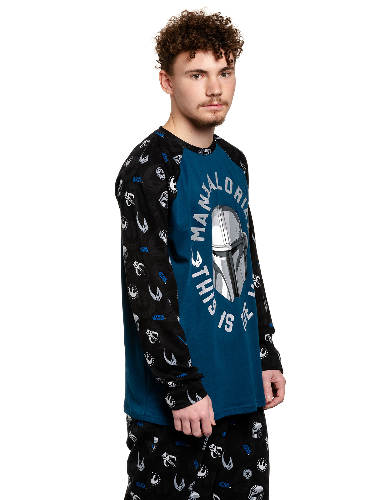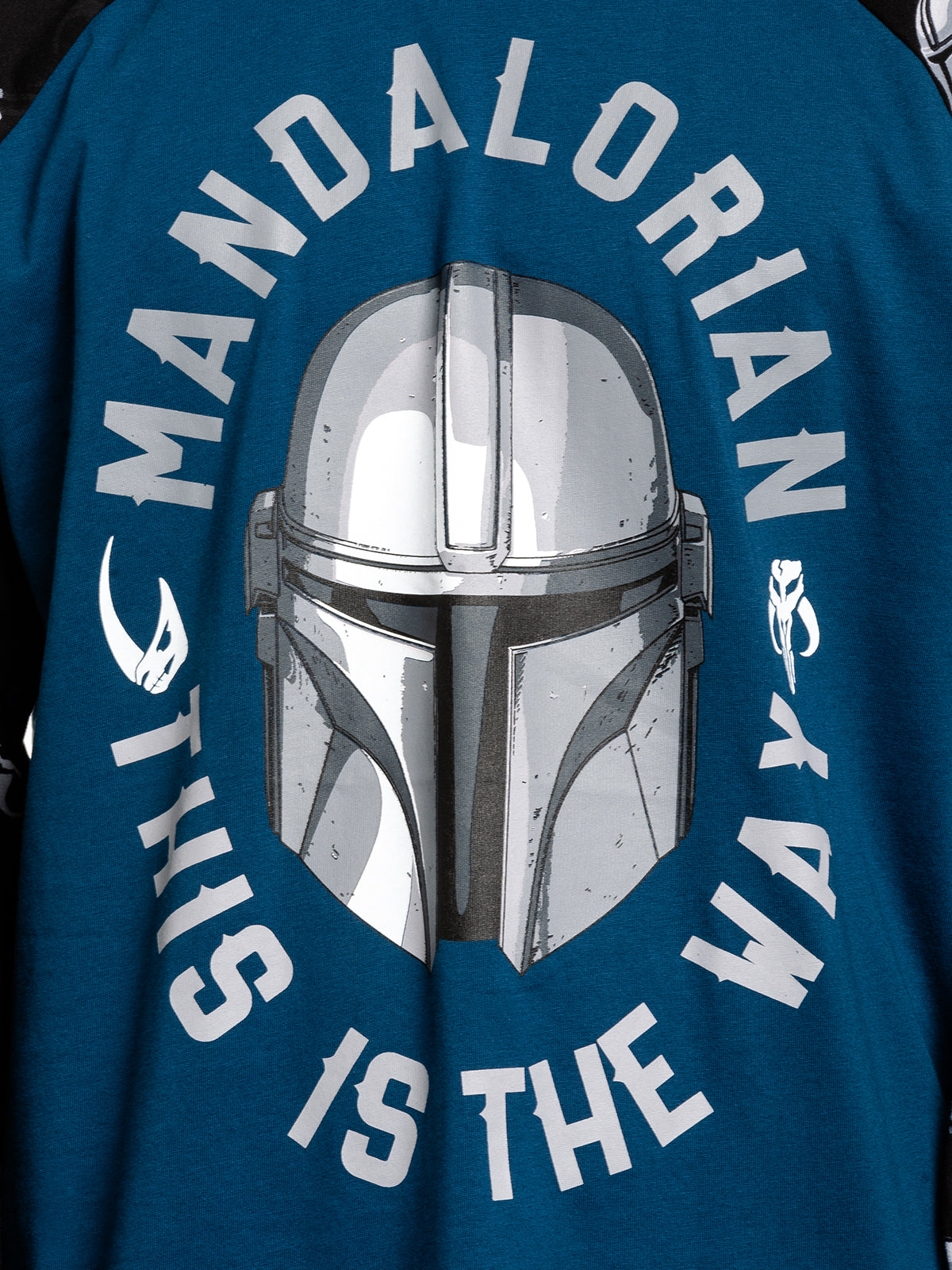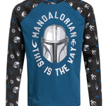 Dieses coole Mandalorian Pyjamaoberteil besteht aus einem angenehmen Baumwollmaterial. Es ist locker geschnitten und hat lange Arme. Als Frontprint findet sich der plakative Kriegerhelm umgeben von dem Schriftzug 'MANDALORIAN - THIS IS THE WAY', was soviel bedeutet wie 'MANDALORIAN - DAS IST DER WEG' auf blau wieder. Die Ärmel sind in schwarz und mit Emblemen aus der Staffel in grau/weiss aus versehen. Hol dir den passenden 'Mandalorian The Way Pyjama' für den nächsten Sofa Star Wars Abend!